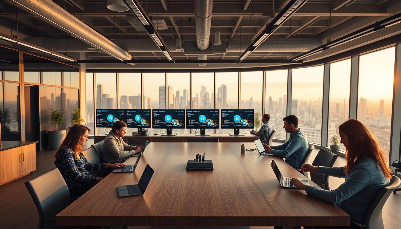 Nutsgeek - an authentic AI-assisted content creation scene. In the foreground, a desktop workspace with a laptop, modern office supplies, and a pair of hands typing on the keyboard. In the middle ground, a floating holographic display shows various media content elements like graphs, charts, and a prototype web page. In the background, a minimalist studio setting with neutral tones, soft lighting, and a large window overlooking a city skyline. The overall mood is one of productivity, innovation, and seamless integration of human and artificial intelligence. The scene portrays a professional, high-tech environment where authentic, data-driven content is being created with the assistance of advanced AI tools and algorithms.