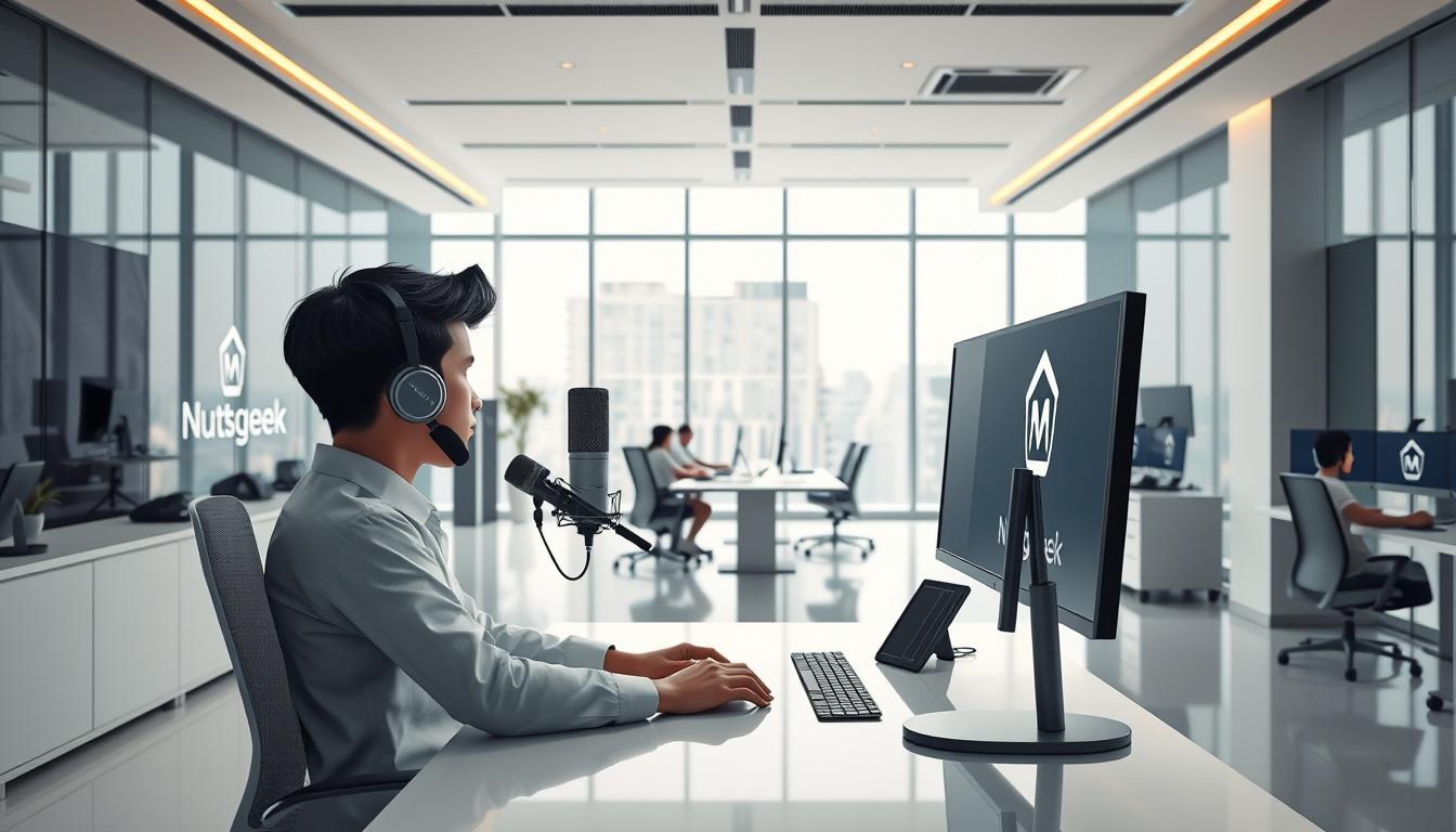 High-quality digital studio shot of a modern office workspace with a laptop, tablet, and microphone on the desk. Warm, diffuse lighting illuminates a clean, minimalist aesthetic. In the foreground, a prominent "Nutsgeek" logo is featured on the hardware, conveying a professional, technology-focused brand. The middle ground showcases various voice recording and editing tools, suggesting the capabilities of AI-powered voice cloning applications. The background depicts a sleek, futuristic cityscape through large windows, hinting at the expansive potential of this innovative industry. The overall mood is one of innovation, productivity, and the fusion of cutting-edge technology with human creativity.