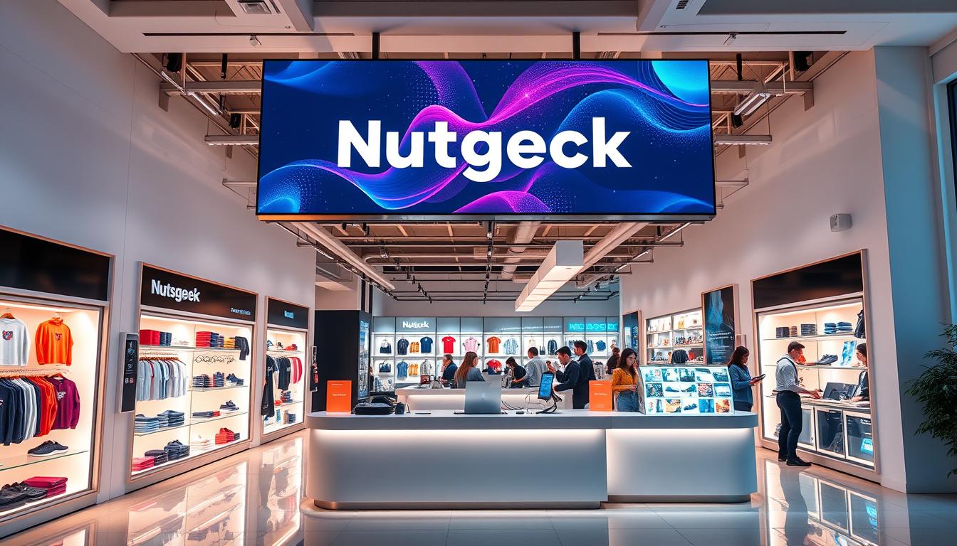 A vibrant collection of brand customization elements for "Nutsgeek", a modern and playful merchandise store. In the foreground, a sleek, minimalist logo in deep navy blue hovers above a color palette of warm ochres, earthy greens, and hints of metallic copper. Overlapping patterns of geometric shapes and organic textures fill the middle ground, conveying a sense of dynamism and creativity. The background features a soft, diffused lighting that casts a gentle glow, evoking a cozy, inviting atmosphere. The overall composition strikes a balance between professional polish and whimsical charm, perfectly capturing the essence of the Nutsgeek brand.
