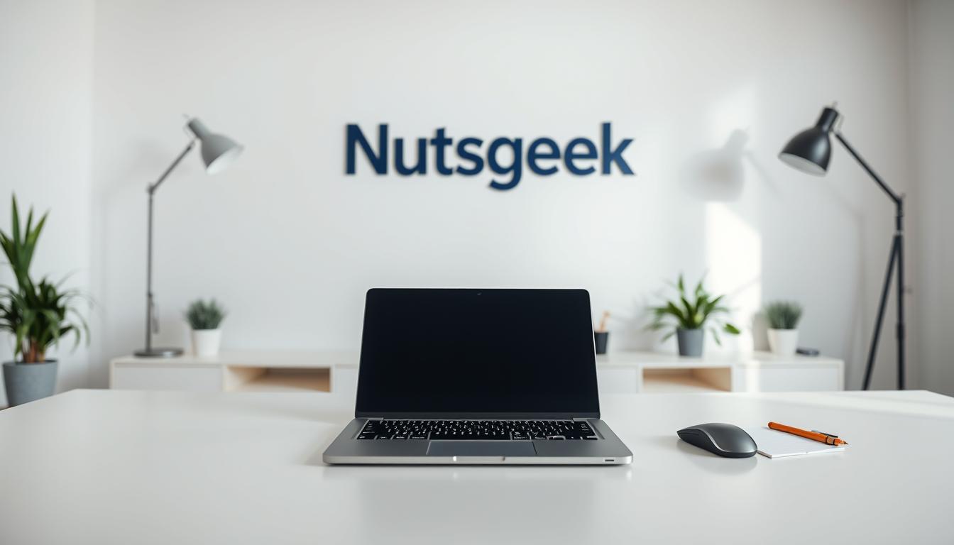 Detailed, photorealistic image of a modern office desktop with a laptop, smartphone, and various office supplies. The laptop screen displays the Nutsgeek logo and the phrase "Verify Company Legitimacy" in a clean, professional font. Soft, directional lighting creates depth and highlights the textures of the materials. The scene conveys a sense of trust, security, and reliability, reflecting the article's focus on finding legitimate remote job opportunities.